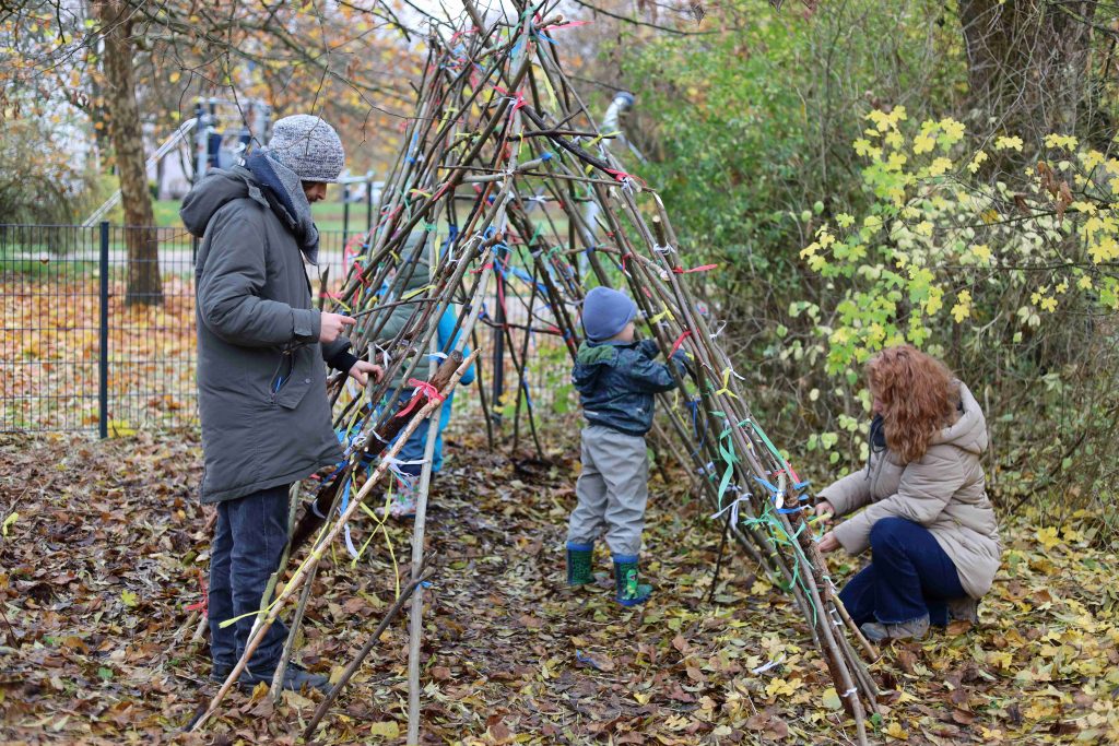 Bei echtem Herbstwetter in der vergangenen Woche hatten wir Besuch von dem bekannten Waldpädagogen Wolfgang Weiß und seinen netten Kollegen. Gemeinsam haben wir eine richtig coole Hütte in unseren Garten gebaut. Die Kinder waren mit Eifer dabei und das Ergebnis kann sich wirklich sehen lassen. Naturmaterialien sind einfach die schönsten Spielsachen für Kinder 🙂 Die Hütte ist sehr begehrt zum Räuberspielen, Verstecken und als Prinzessinnenverlies. Und das Beste – sie kann sogar immer größer gebaut werden. Die Ausrüstung dafür sammeln wir bei den nächsten Ausflügen. Eine tolle Sache!!!